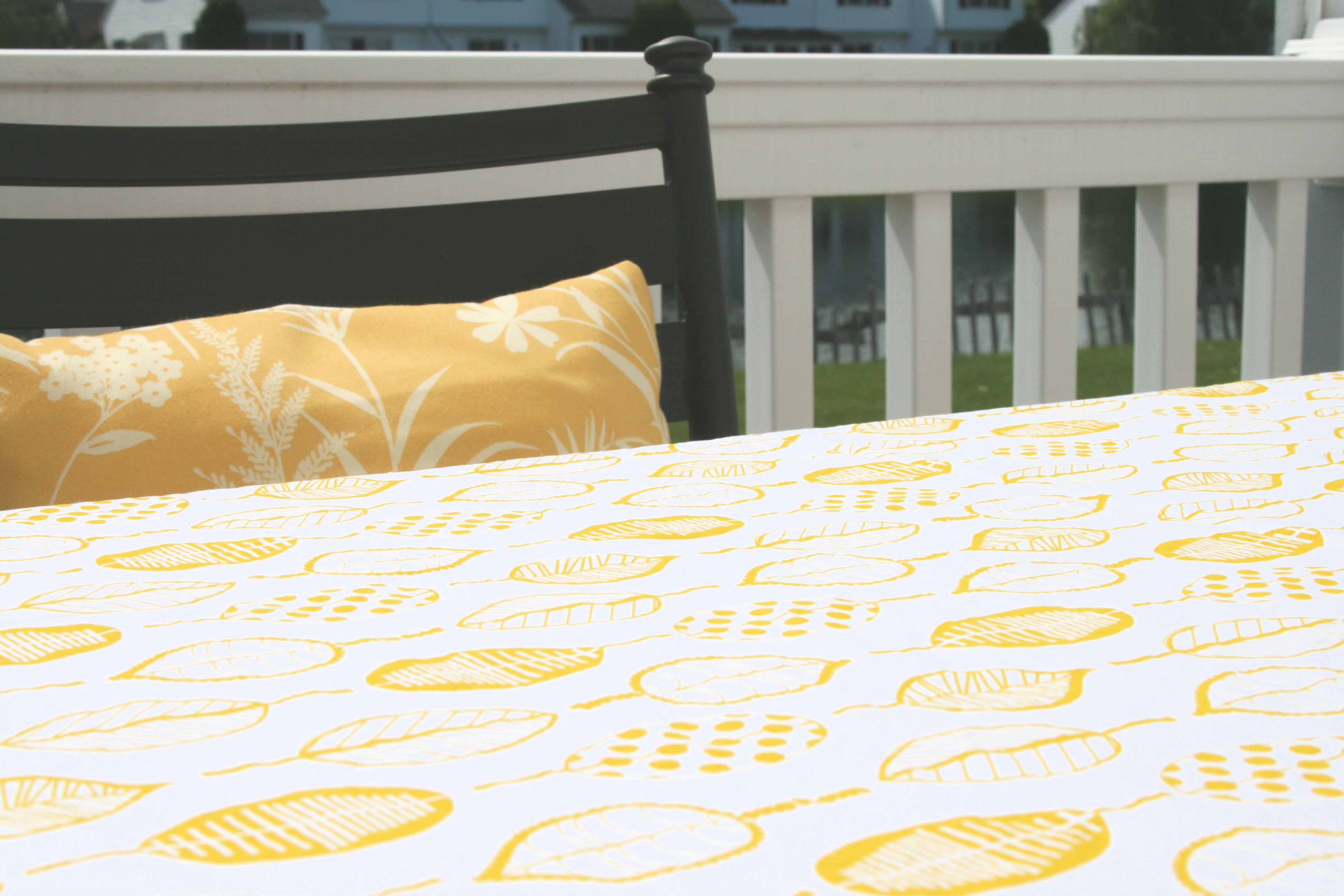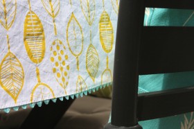 I like to dress the deck up on sunny days. Even when I can’t be out there, it’s nice to catch a glimpse of this cheerful scene. The tablecloth is one I made out of some Robert Kaufmann bamboo fabric (love the lemon yellow!) with some fun turquoise rick rack that I picked up at a yard sale.
