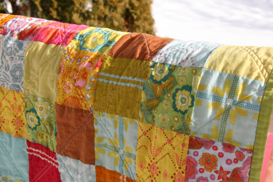 We’ll call this the first finished quilt of 2010 (it’s actually the third, but since I have yet to show you the first two, this can become the first). As I mentioned in this post, I decided to use prints from Anna Maria Horner’s Little Folks line, specifically the prints from the Playground palette, with a few extra blues added in for good measure.