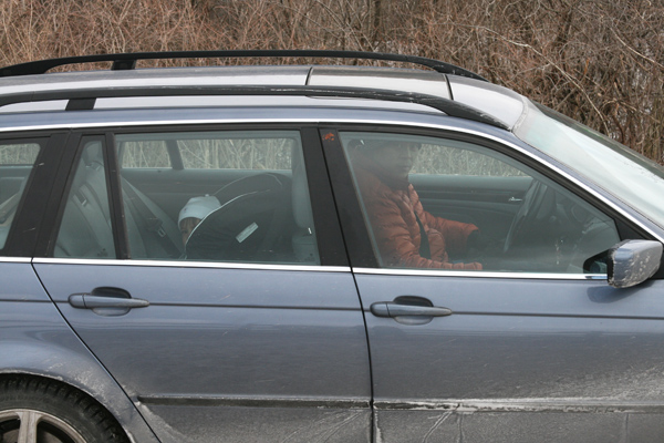 Wouldn’t you know that I decided to go out to take photos of this quilt on one of the coldest days of this winter? Morgan and Max were not thrilled about the outing, and spent most of it like this, watching me from the warmth of the car as I wrestled around with this quilt.